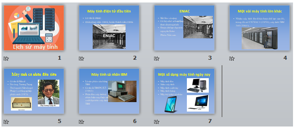 1. Đọc bài viết “Lịch sử máy tính” (sgk trang 109→111) để lập dàn ý làm nội dung để tạo bài trình chiếu về chủ đề này.