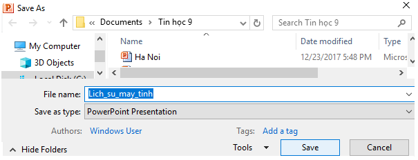 * Lưu bài trình chiếu: Để lưu kết quả làm việc, chọn lệnh Save trong bảng chọn File. Cửa sổ Save As hiện ra, em thực hiện chọn thư mục lục để lưu, đặt tên bài trình chiếu và nháy Save để lưu.