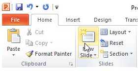 + Nháy lệnh New Slide trong nhóm Slides trên dải lệnh Home để chèn thêm trang chiếu mới: