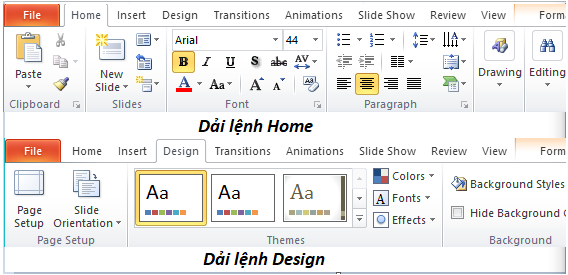 * Định dạng trang chiếu: Sử dụng các lệnh trong hai dải lệnh Home và dải lệnh Design để định dạng trang chiếu.