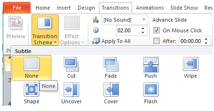 3. Nháy lệnh Apply To All trong nhóm Timing nếu muốn áp dụng kiểu hiệu ứng chuyển đã chọn cho mọi trang chiếu của bài trình chiếu; nếu không, hiệu ứng chỉ được áp dụng cho các trang chiếu đã được chọn trước.