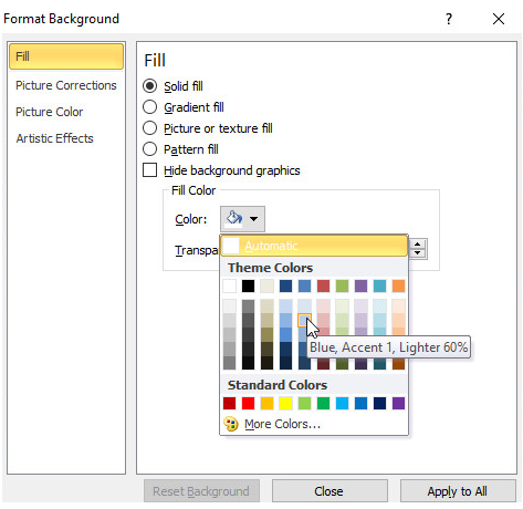phía dưới, bên phải nhóm lệnh Background để hiển thị hộp thoại Format Background. Thực hiện các tùy chọn để định dạng màu nền cho trang chiếu.