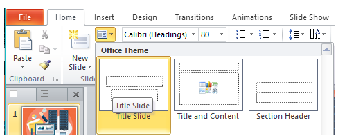 + Nháy lệnh New Slide trong nhóm Slides trên dải lệnh Home để chèn thêm trang chiếu mới:
