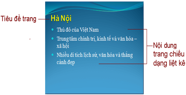 • Nội dung được chiếu cho mọi người cùng quan sát được gọi là trang chiếu và tập hợp các trang chiếu đó tạo thành bài trình chiếu.
