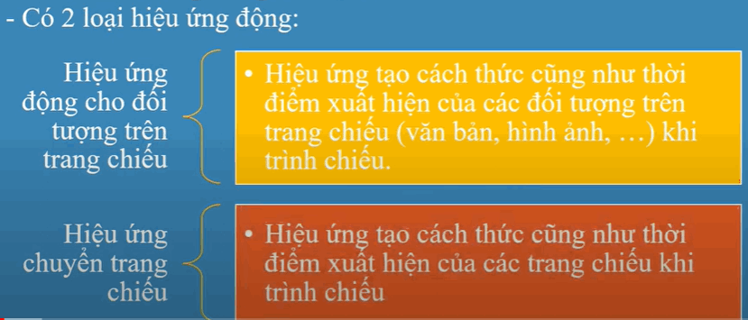 Khi tạo hiệu ứng động cho một khối văn bản ta có thể cho xuất hiện lần lượt từng từ trong khối văn bản khi trình chiếu, Có thể thực hiện hiệu ứng chuyển trang cho 1 slide bất kỳ hoặc tất cả các slide trong bài trình diễn. Vì vậy có thể thay đổi kiểu hiệu ứng cho các dối tượng trong slide tùy ý.